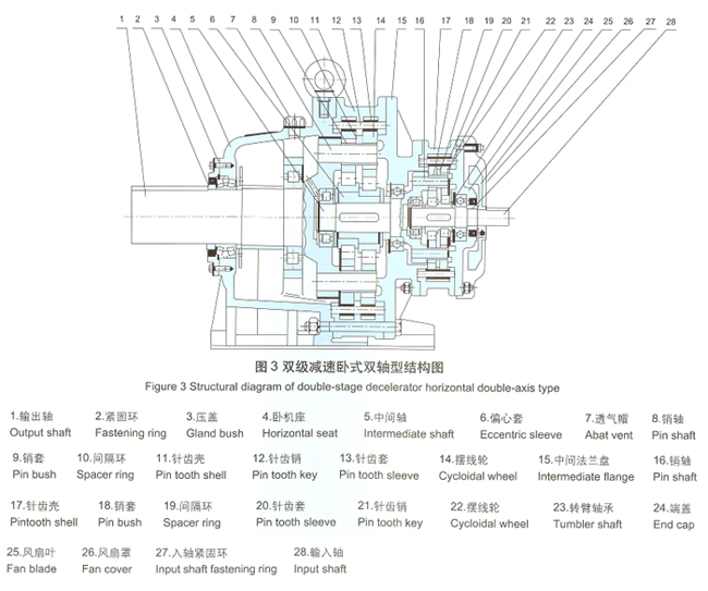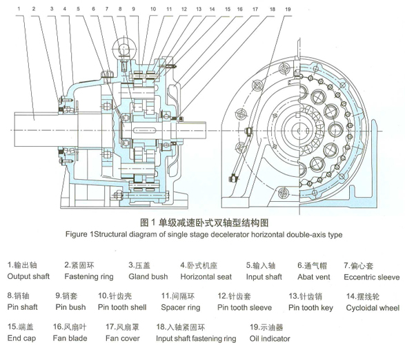 擺線針輪減速機全部傳動裝置可分為三部分:輸入部分.減速部分、輸出部分。
